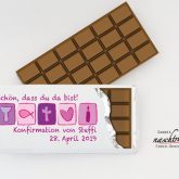 Kleine Schokoladentäfelchen aus zartschmelzender Vollmilchschokolade in Premiumqualität mit individuell personalisierbaren Aufklebern.