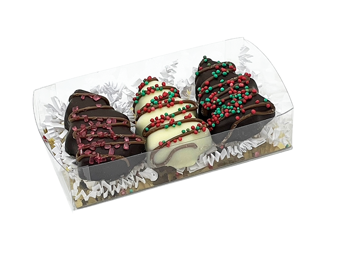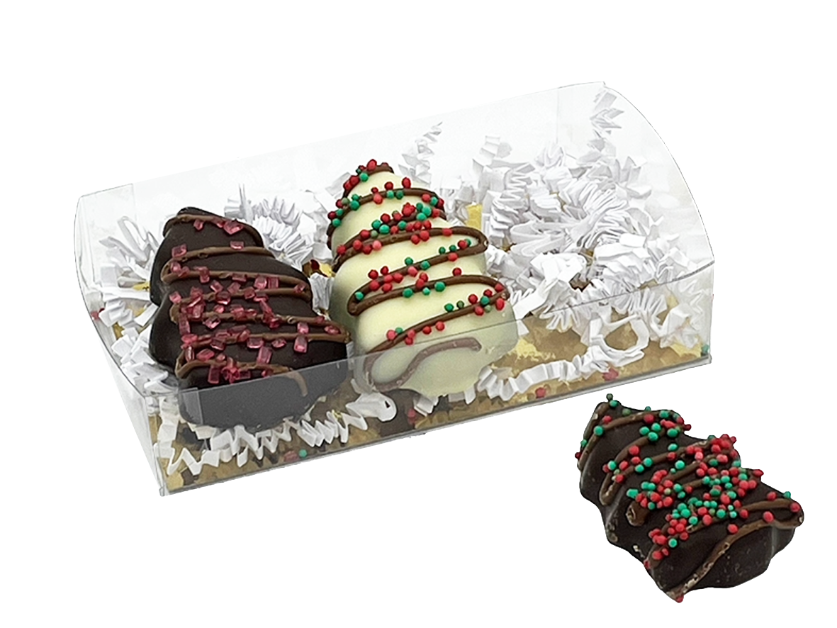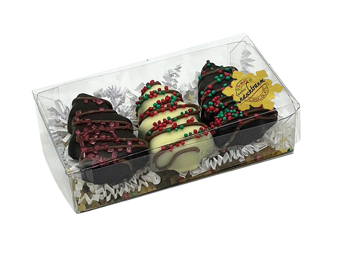 Tannenbüme aus gefüllter Zartbitter (Kakao: 54% mindestens), Edelvollmilch (Kakao: 32% mindestens), und weißer Schokolade (Kakao: 28% mindestens), dekoriert