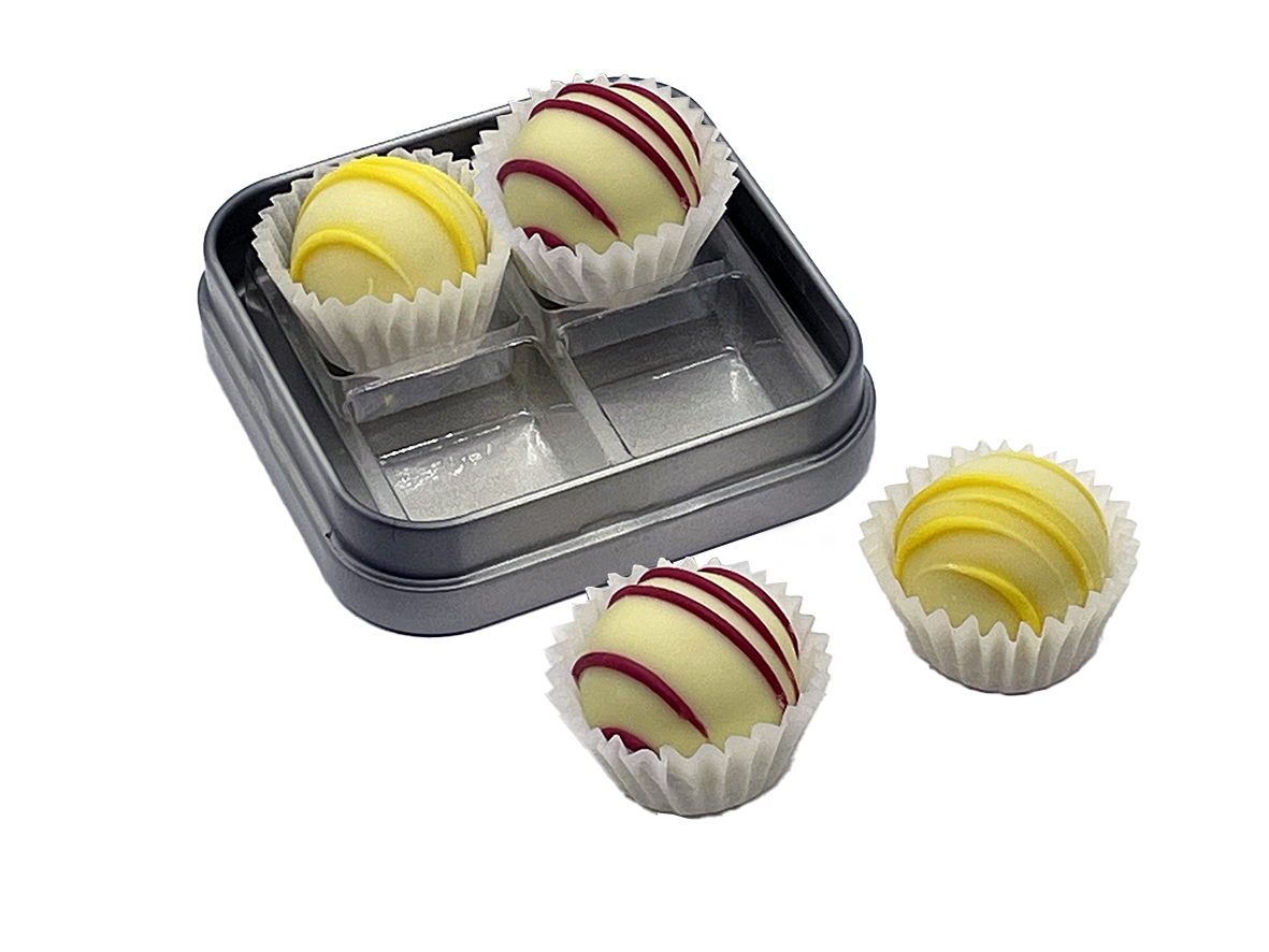 4 edle Trüffel aus gefüllter weißer Schokolade (Sorten: Limoncello & Apfelkuchen)