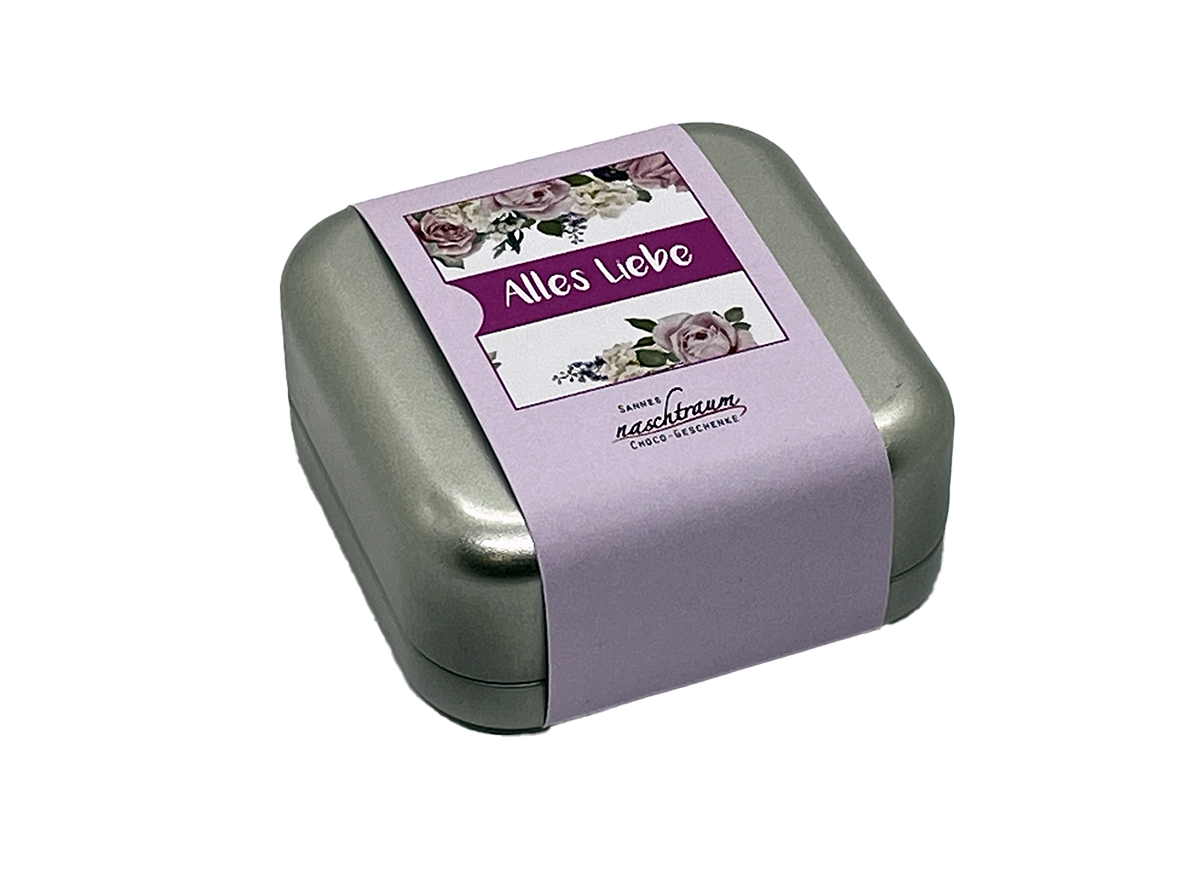 Sag es mit Blumen und Schokolade – vereint in einer wunderschönen Geschenkidee. Unsere silberfarbene Metalldose besticht durch eine hochwertige Banderole in zarten Rosa- und Lilatönen, verziert mit einem romantischen Rosendesign und dem Schriftzug „Alles Liebe“. Ob zum Geburtstag, zum Jahrestag oder einfach als liebevolle Geste zwischendurch: Dieses Präsent von Sannes Naschtraum mit 4 handgemachten Trüffeln in den sommerlich-frischen Sorten Limoncello und dem heimeligen Geschmack von Apfelkuchen zeigt dem Beschenkten, wie viel er dir bedeutet.