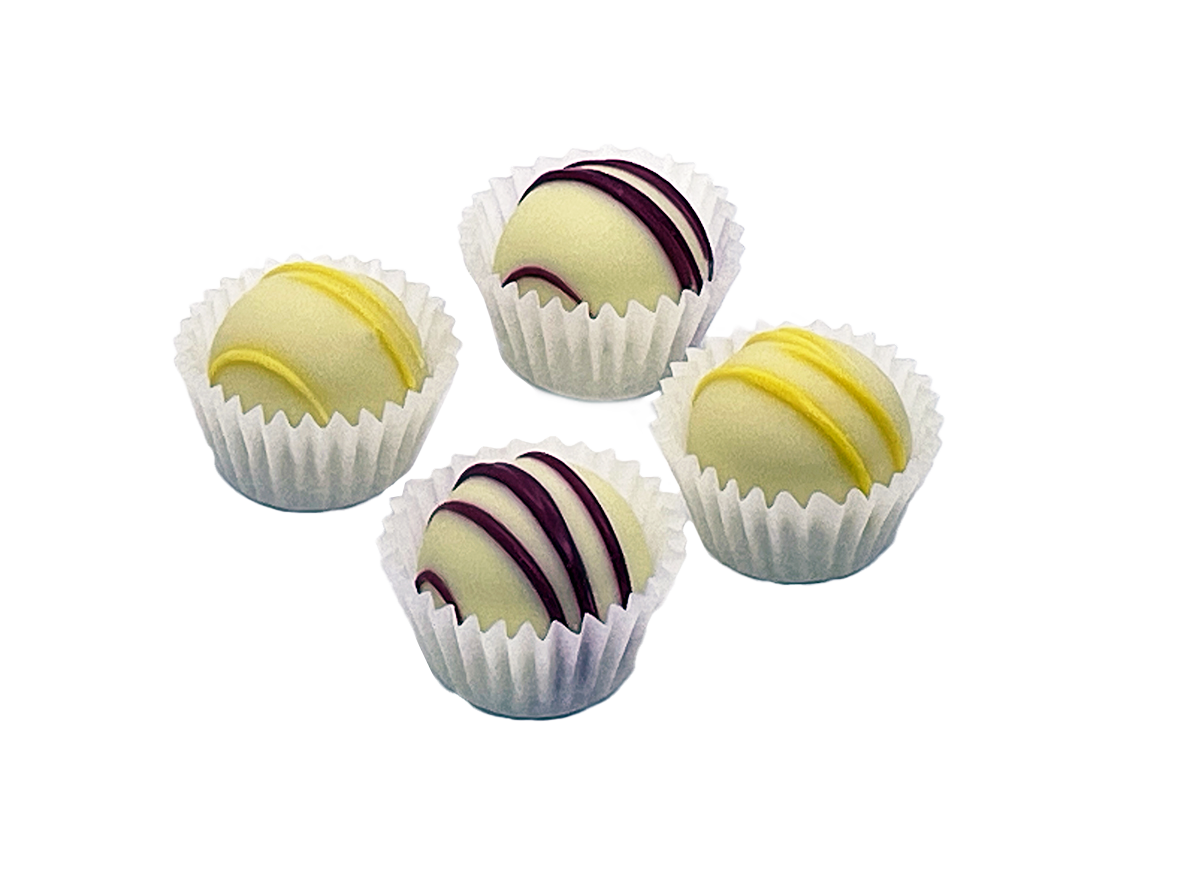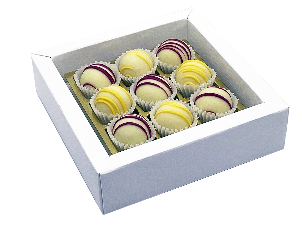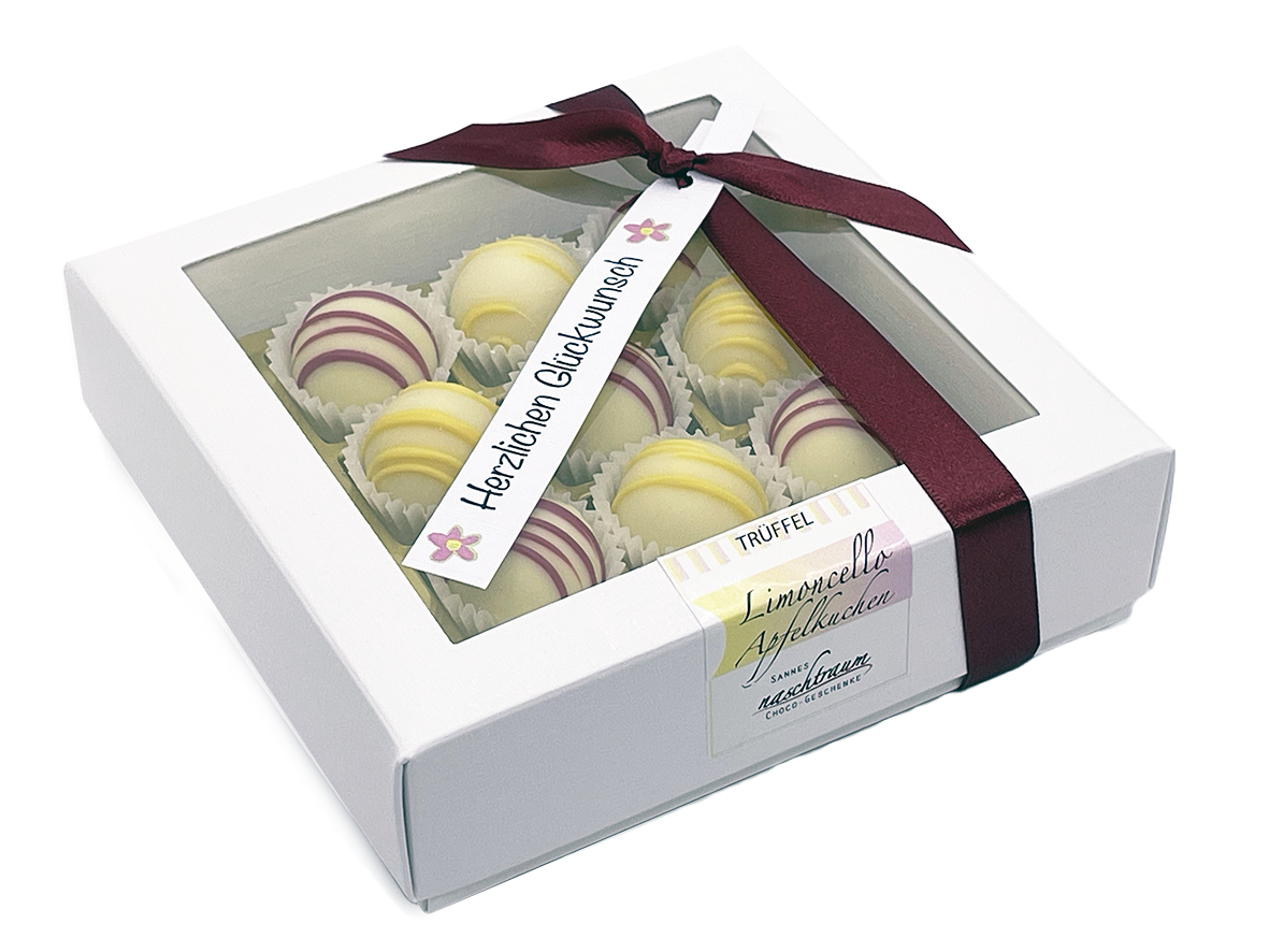 9 edle Trüffel aus gefüllter weißer Schokolade (Sorten: Limoncello & Apfelkuchen). - Verpackung: