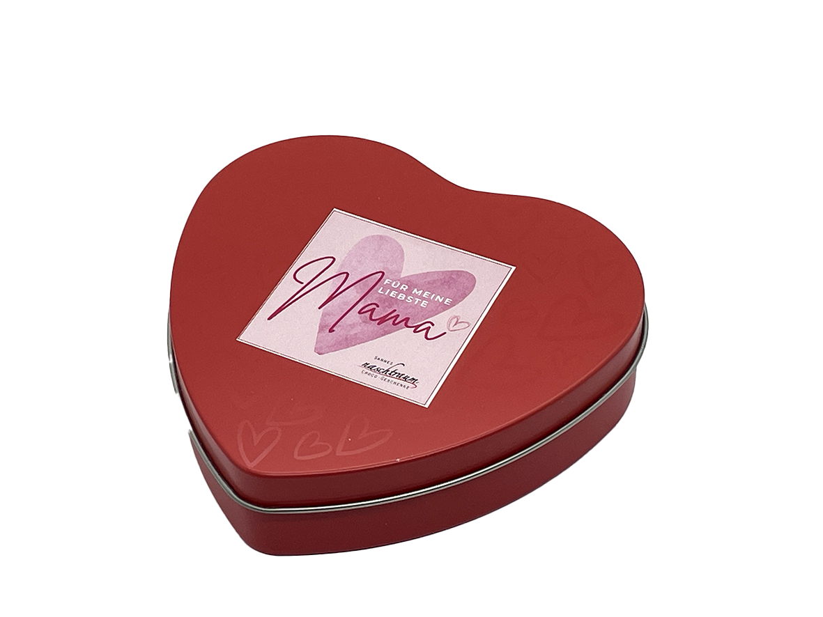 Sag es mit Schokolade! Überrasche deine Mama dieses Jahr mit einem Geschenk, das direkt von Herzen kommt. In unserer edlen, roten Metalldose verstecken sich 6 zartschmelzende Haselnuss-Nougatherzen,