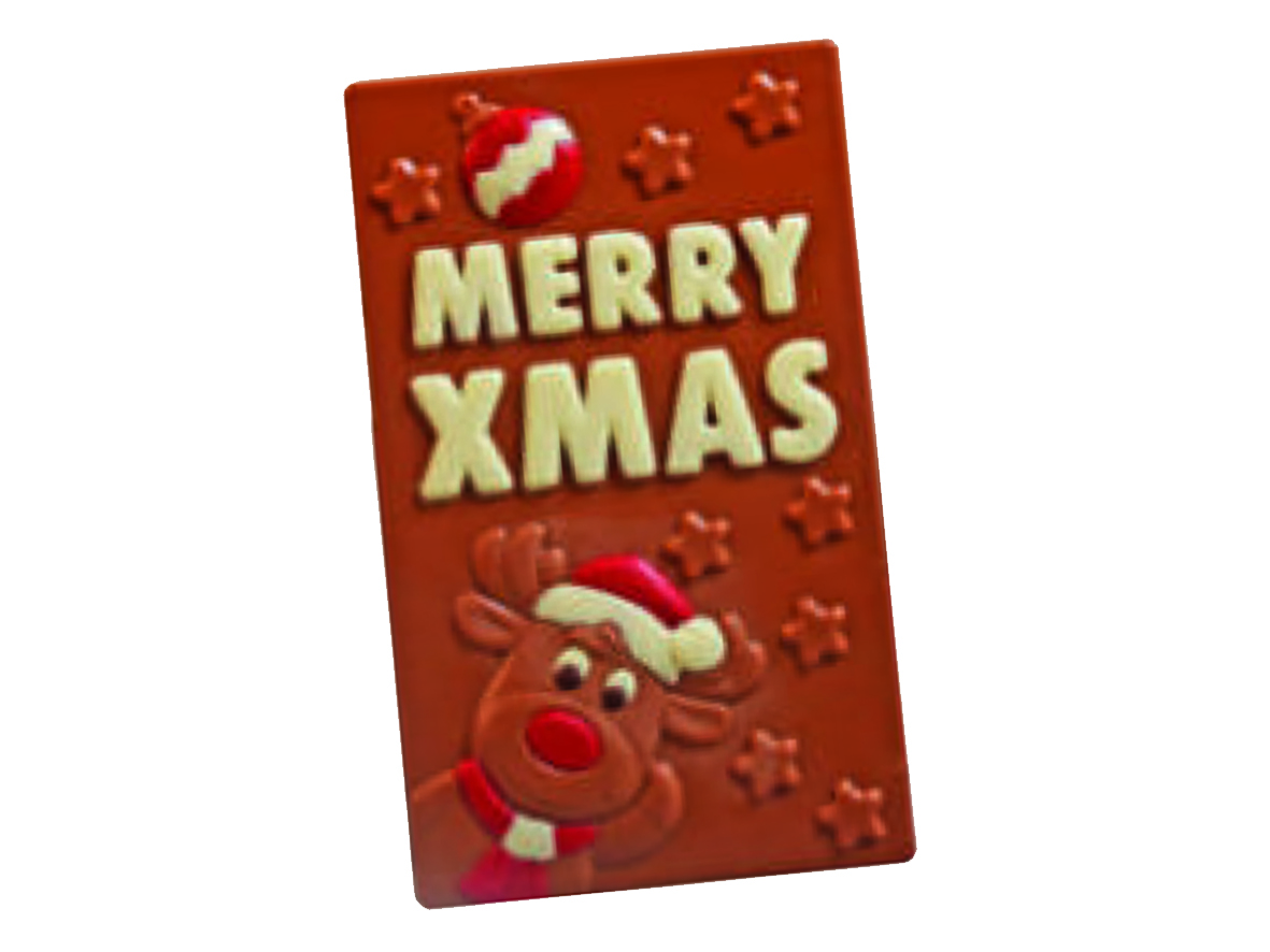 Diese feine Vollmilchschokolade in Premiumqualität wird liebevoll dekoriert mit einem Rentier mit roter Nase, einer Christbaumkugel, Sternen und dem Schriftzug „Merry XMAS“ aus eingefärbter weißer Schokolade. Ein echter Hingucker – und fast zu schön zum Naschen!